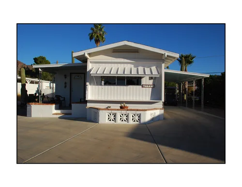 39 Winter Retirement Homes on my parents street in Tucson Arizona 2007; I took a walk while visiting my parents in 2007 at their modest winter home (theirs is #3) in Tucson, Arizona. I was struck by the beautiful light and the orderly homes and surroundings in that community of manufactured homes. Their community was populated in large part by retirees of their generation, many were World War II veterans and their spouses. This collection of photographs make me reflect on that group of people, the lives they lead and those modest homes that they so obviously took great pride in. My parents are no longer with us but that evening, the walk I took and my thoughts of that orderly modest community and what it represents live with me in this group of photographs.